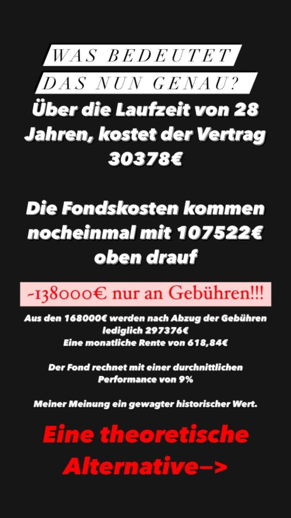 In der Regel reden wir hier über eine Anlage über mehrere Jahre oder Jahrzehnte, infolgedessen können schon wenige Prozent Gebühren enorme Kosten verursachen. Da das Ganze in den Verträgen ziemlich unverständlich verpackt ist, habe ich das anhand eines Beispiels einmal aufgeschlüsselt.