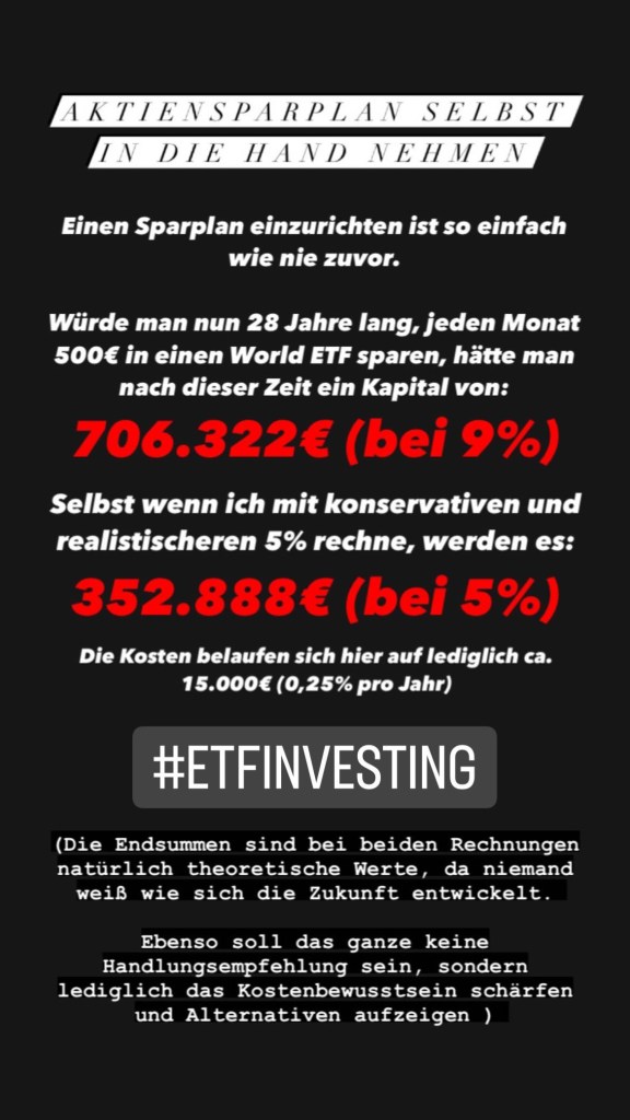 Ich möchte hier anmerken, dass das Investieren in Einzelaktien und Sektor– oder Nischen ETFs nicht unbedingt zu empfehlen ist, da hier ein großes Vorwissen erforderlich ist. Eine deutlich bessere Wahl für die meisten Anleger:innen wären breitgestreute Welt-ETFs, aktiv gemanagte Fonds oder eine Kombination aus beidem.