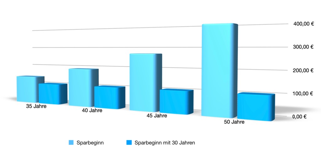 Je früher du beginnst, desto weniger musst du monatlich zurücklegen um auch später finanziell Sorglos leben zu können. In der Grafik unten siehst du einmal den Unterschied zwischen einem frühen und späten Beginn. Solche Sparraten sind notwendig um später auf ca. 500€ zusätzliche Rente zu kommen.